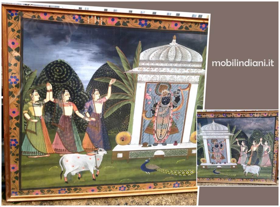 L'immagine raffigura Shrinathji, una forma del Dio Krishna, all'interno di un santuario. Il tempio principale di Shrinathji si trova a Nathdwara, in Rajasthan, India. La divinità è raffigurata con la mano sinistra alzata a simboleggiare il sollevamento del monte Govardhan e la mano destra è poggiata sul fianco. L'immagine di Shrinathji è realizzata da un'unica lastra di marmo nero e si ritiene che si sia manifestata da sola. Ai lati del santuario, sono presenti della figure femminili; Le Gopi, tre per lato, in posa di adorazione. Il nome "Gopi" ha origini sanscrite, significa letteralmente "pastore di mucche" o "compagna di giochi di Krishna" Mis. cm.142,5 h.89 spess.4 Pronto da appendere. SOLO RITIRO PRESSO NS. SEDE COSTO ZERO. Info su WhatsApp o mail: info@mobilindiani.it