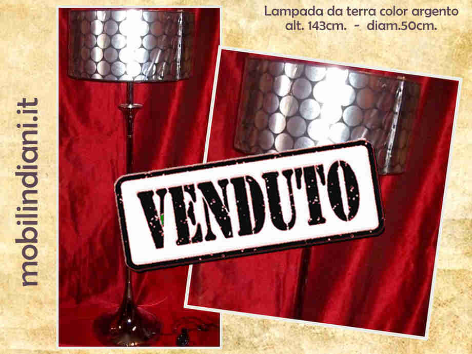 Disponibilità 0Lampada da terra stile vintage cromata. Coprilampada colore nero e argento. Alt. cm.143 Diam. coprilampadina cm.50 Completa di kit elettrico, accensione a pedale