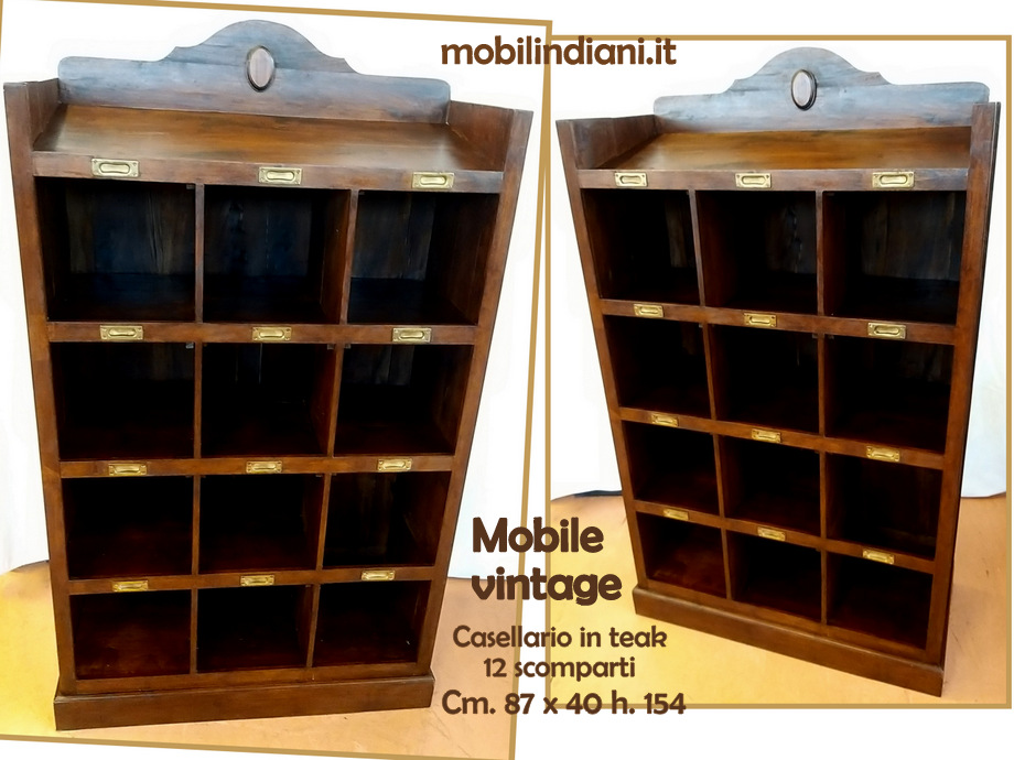 Disponibilità 1Mobile vintage. Casellario in legno teak, 12 scomparti con porta etichetta in ottone. Il mobile è completamente restaurato in Italia. Cm.87x40 h.154 Provenienza Indonesia PER INFO COSTI SPEDIZIONE CHIEDI su WhatsApp o via mail: info@mobilindiani.it