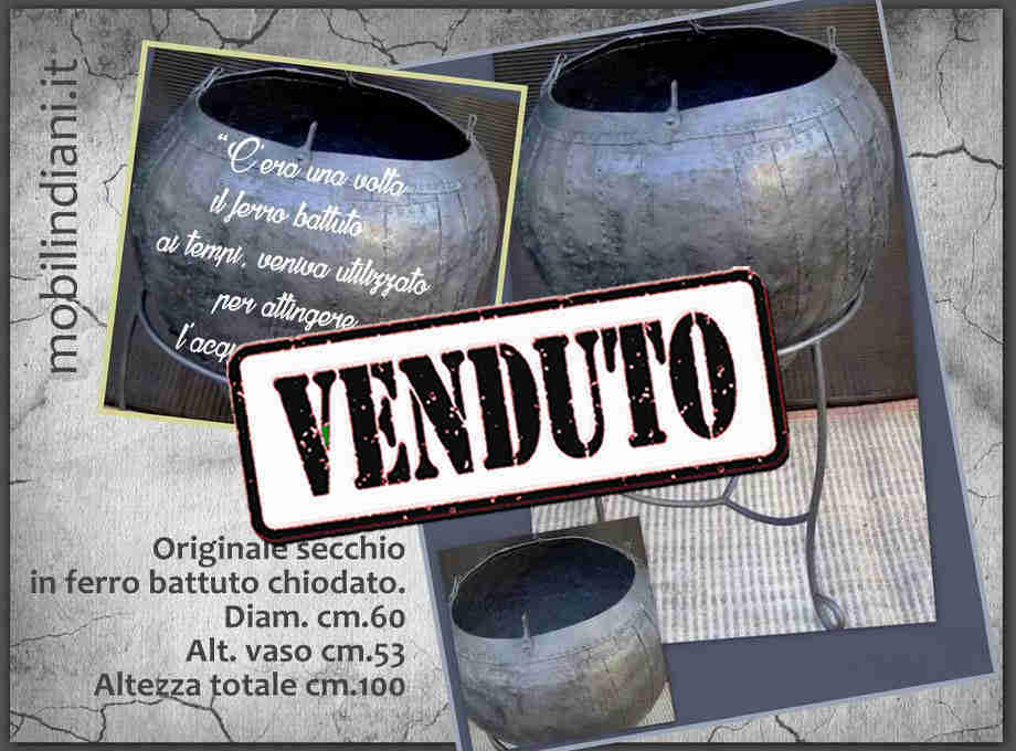 Disponibilità 0Antico e originale secchio in ferro battuto chiodato. C'era una volta il ferro battuto...ai tempi, veniva utilizzato per attingere l'acqua dai pozzi. Diam. cm.60 Alt. vaso 53 Alt. totale 100 Paese Marocco