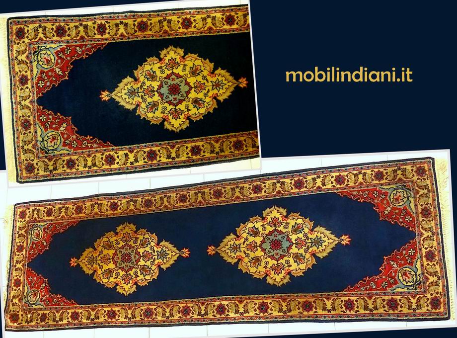 Passatoia persiana Saruq (o Saruk) Epoca prima metà XX Secolo. Fondo "blu Persia" intenso, medaglioni centrali e bordura floreale color crema. Cm.230x75 Tappeto pregiato di solidità struttura, lana soffice, eccellente e compatta (vedi foto) caratteristiche che li hanno resi famosi in tutto il mondo. Il tappeto Saruq, rientra nelle categorie più alte di tappeti persiani. COSTO TRASPORTO €. 29,00 Iva Inclusa. Per costi trasporto Isole, chiedi info su WhatsApp o mail: info@mobilindiani.it