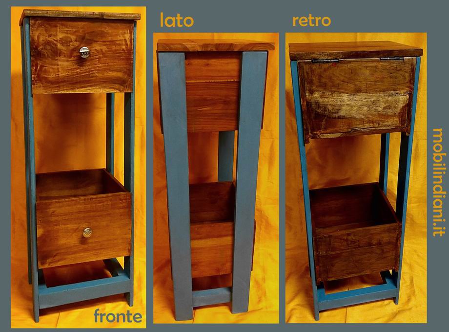 Disponibilità 1Mobiletto stile vintage alto 1 cassetto con coperchio + 1 cassetto aperto. Fasce laterali color "jeans" Realizzato artigianalmente in legno sheesham (noce) massello, molto robusto.Cm.35,5x31 h.103 COSTO TRASPORTO €. 35,38 Iva Inclusa. Per costi trasporto Isole, chiedi info su WhatsApp o mail: info@mobilindiani.it