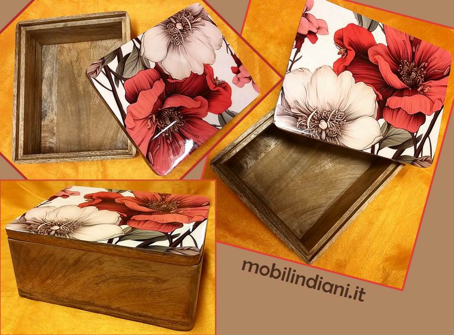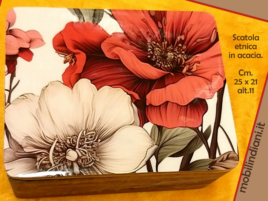 Disponibilità 1Box - bauletto indiano in legno acacia finitura a cera naturale, coperchio dipinto e laccato. Cm.21x25 h.11 Origine India COSTO TRASPORTO €. 12,81 Iva Inclusa. Per costi trasporto Isole, chiedi info su WhatsApp o mail: info@mobilindiani.it