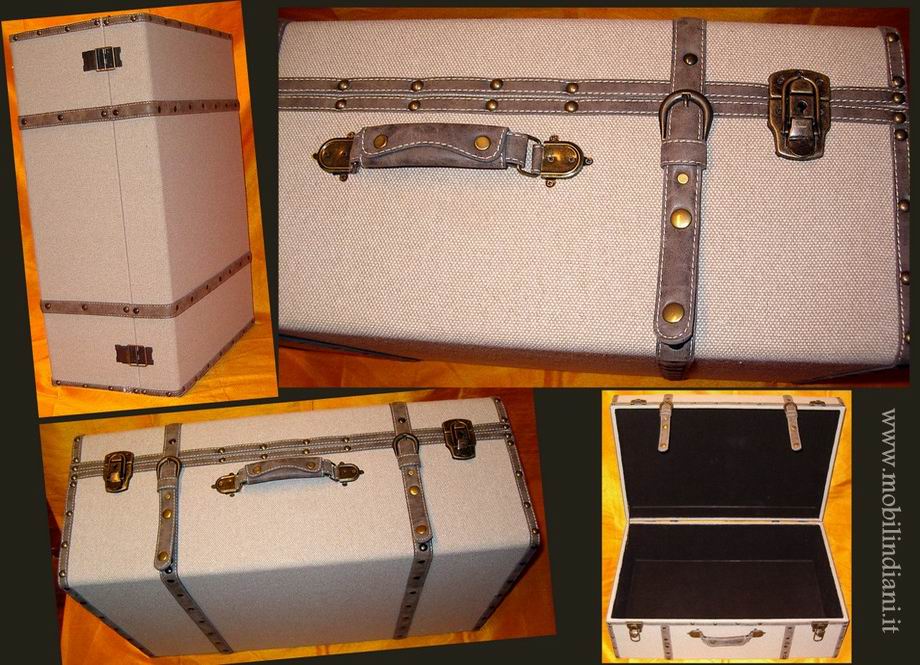 Disponibilità 4Valigia stile vintage da interno, in legno rivestito in tessuto color corda e in tessuto nero internamente. Impreziosita da cinghie in ecocuoio e rivetti color bronzo. Ganci di chiusura a chiavistello. IDEALE PER LA BIANCHERIA. Cm.67x46 h.27 Paese Francia. COSTO TRASPORTO €. 35,38 iva inclusa. Per trasporto Isole invia mail a info@mobilindiani.it